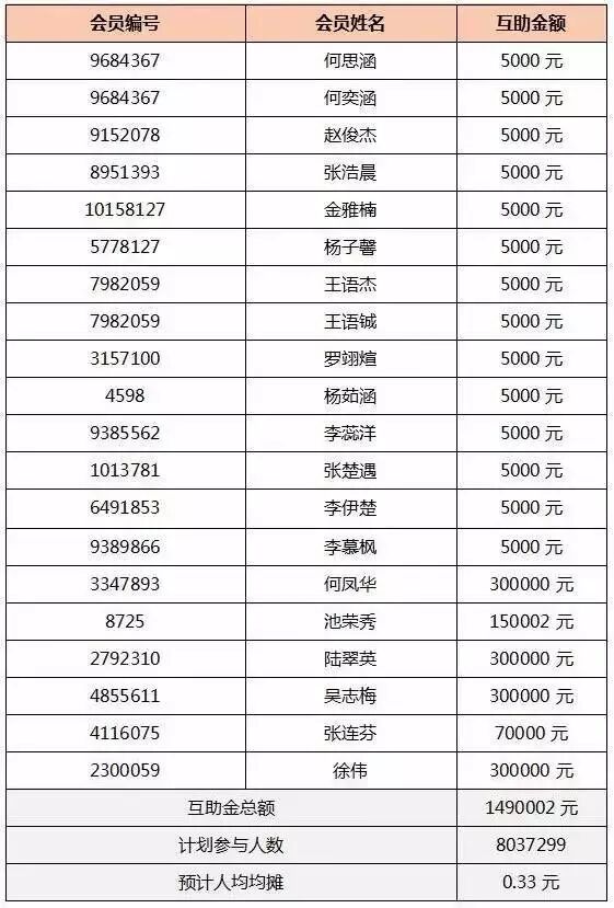本期共公示20起互助成功的案例,每人均摊0.33元,为20个家庭伸出了援手。 大大的城市,小小的爱,小帮先替这20个家庭谢谢大家!也希望受助者可以安好无忧,尽快康复! 拼搏之余记得兼顾身体健康,爱家人也要爱自己! 下面一起来看看本期的公示详情: 事件公示 本期互助事件于2017年8月22日发布互助事件公示,至2017年8月28日七天公示结束,平台已将互助金划拨到本次互助事件申请人的指定帐户。点此查看互助事件公示详情>>> 互助详情 大病医疗互助 上期结余 44177.6元,本期结余1095536.27元 。 何思涵 2岁 2017年04月25日 何思涵监护人为其加入众托帮大病医疗互助 何奕涵 1岁 2017年04月25日 何奕涵监护人为其加入众托帮大病医疗互助 赵俊杰 4岁 2017年03月29日 赵俊杰监护人为其加入众托帮大病医疗互助 张浩晨 5岁 2017年03月18日 张浩晨监护人为其加入众托帮大病医疗互助 金雅楠 1岁 2017年05月21日 金雅楠监护人为其加入众托帮大病医疗互助 杨子馨 5岁 2016年12月13日 杨子馨监护人为其加入众托帮大病医疗互助 王语杰 8岁 2017年02月14日 王语杰监护人为其加入众托帮大病医疗互助 王语铖 1岁 2017年02月14日 王语铖监护人为其加入众托帮大病医疗互助 罗翊煊 2岁 2016年10月12日 罗翊煊监护人为其加入众托帮大病医疗互助 杨茹涵 2岁 2016年12月29日 杨茹涵监护人为其加入众托帮大病医疗互助 李蕊洋 5岁 2017年04月11日 李蕊洋监护人为其加入众托帮大病医疗互助 张楚遇 0岁 2017年03月16日 张楚遇监护人为其加入众托帮大病医疗互助 李伊楚 2岁 2017年04月13日 李伊楚监护人为其加入众托帮大病医疗互助 李慕枫 0岁 2017年04月10日李慕枫监护人为其加入众托帮大病医疗互助 何凤华 53岁 2016年10月16日 何凤华加入众托帮大病医疗互助 池荣秀 65岁 2017年01月05日 池荣秀加入众托帮大病医疗互助 陆翠英 60岁 2016年10月09日 陆翠英加入众托帮大病医疗互助 吴志梅 51岁 2016年11月21日 吴志梅加入众托帮大病医疗互助 张连芬 47岁 2016年11月03日 张连芬加入众托帮大病医疗互助 徐伟 27岁 2016年09月17日 徐伟加入众托帮大病医疗互助