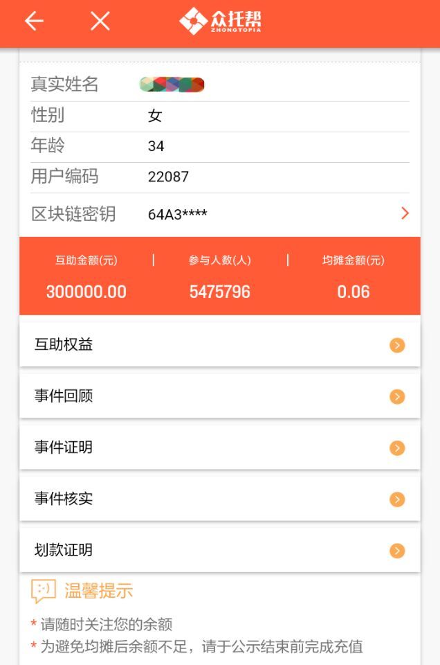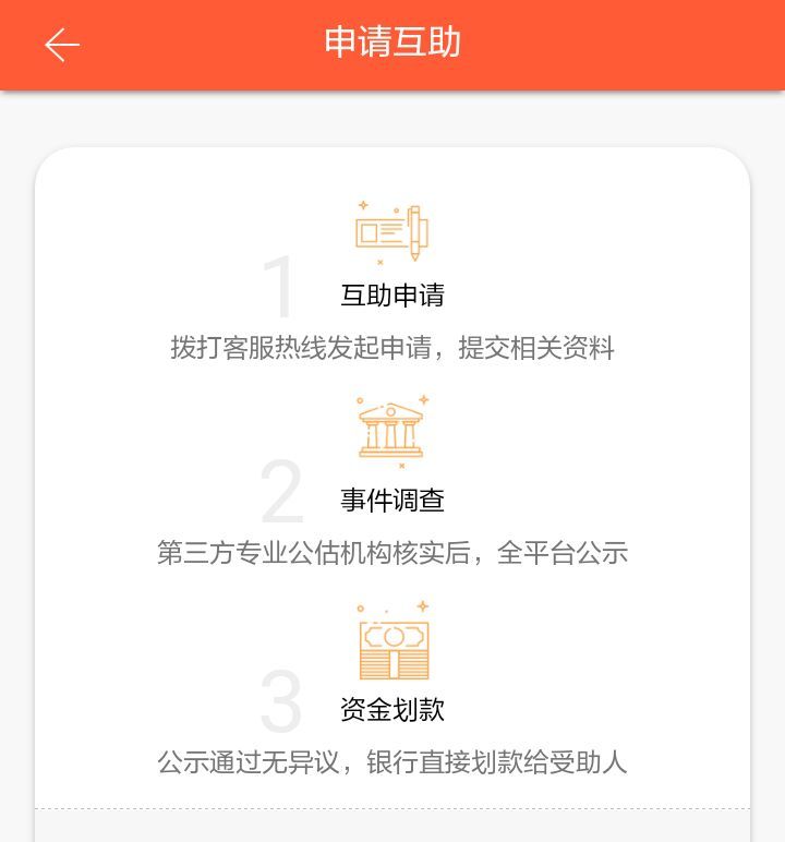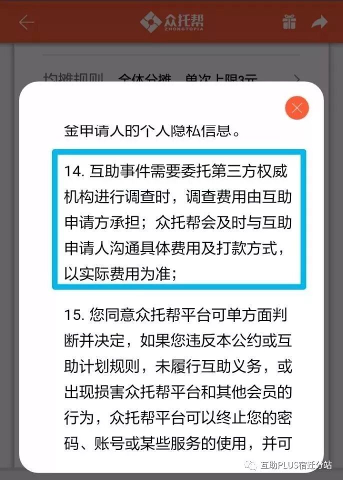 第三方调查机构: 平台与会员之间的事件见证人 《互助申请流程》(步骤) 大病发生确诊时起,10日内及时向互助平台申请报备,并在互助平台指引下提交相关互助申请材料: 第一步:互助申请 第一步:事件调查 第一步:资金划款 第三方调查机构: 平台和会员之间事件的见证人 提交互助申请时,需要一定额度的合理的调查押金,具体以互助平台与申请者沟通为准。调查结束后,给予互助的则从互助金中抵扣回相应部分。 第一:平台所有会员承担分摊 第二:仅受助会员承担负责 大多数平台是采纳第二种 下面例举:众托帮 儿童手足口5000元互助金的调查费:500元 正常案例.简单事件调查费:3000元 复杂事件、偏远地区、跨多省市区或境外调查 因实际情况而预估和实际报销。 以下是互助平台《会员公约》第四项的第二条之第14条里有明确的约定: 网络互助平台 互助平台是我们所有互助会员互助的发起者,所有的互助金依然是我们全体互助会员的,所预存的互助金是通过平台公益基金会委托第三方银行托管,资金安全,专款专用于后期大病会员的扣助。 互助金与社保+商保资金的区别 互助金:不作投资和分红。专款专用(专用于会员扣助) 社保金:可以投资股票或其它国家公共事业,但不分红。 商保金:可以投资股票或其它公共国家事业或海外投资,可以参与分红。